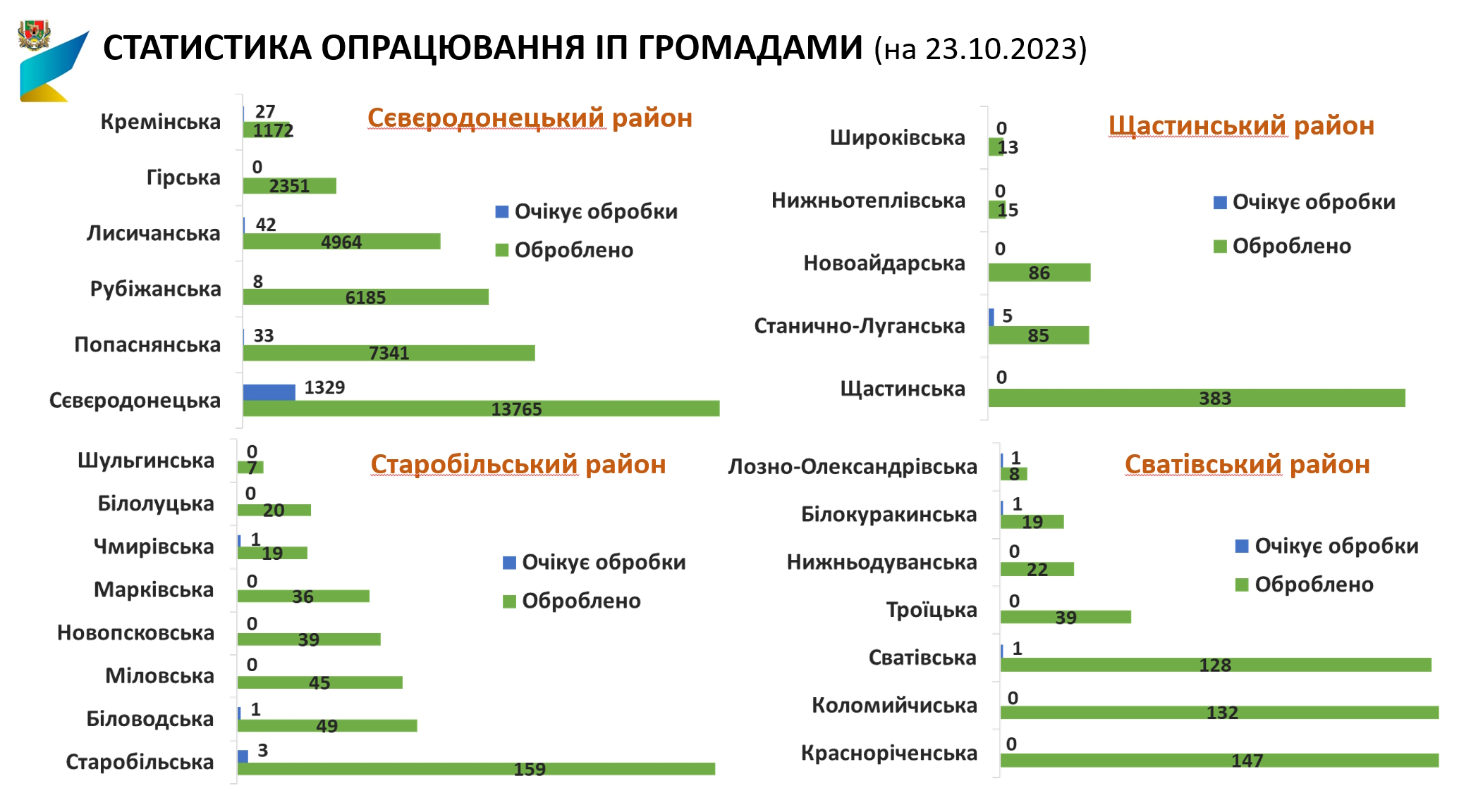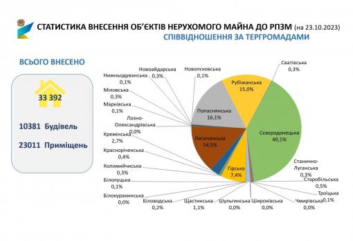 Із числа внесених об’єктів 40,1 % розташовані у Сєвєродонецькій міській територіальній громаді; 16,1 % – у Попаснянській; 15 % – у Рубіжанській; 14,5 % – у Лисичанській; 7,4 % – у Гірській.