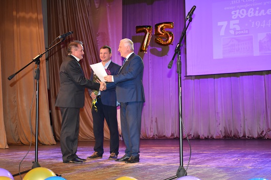 З привітаннями з нагоди ювілею звернувся до усіх присутніх виконуючий обов’язки міського голови Вячеслав Ткачук: «Шановні педагоги, шановні ветерани! Сьогодні славна дата, яку ви відзначаєте в колективі. 75 - це зріла дата. Історія вашого навчального закладу тісно була переплетена з моєю діяльністю як будівельника. Саме ви забезпечували місто фахівцями будівельних професій. Разом з вами ми побудували це місто Сєвєродонецьк, його промислові об'єкти, його інфраструктуру. У цьому ваша велика заслуга. Важливо, що ви сьогодні разом, ви вистояли, ви розвиваєтеся, ви в лідерах, у вас професійний педагогічний колектив. Вами можна пишатися. Дуже важливо, що в залі молодь. Це - наше майбутнє. Наші інженери, проектанти, мери, президенти. Ветеранам - низький уклін! Здоров'я, достатку, благополуччя! Зі святом!»