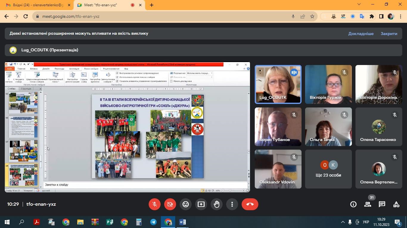 11 жовтня 2023 року відповідно до планів роботи Департаменту освіти і науки Луганської обласної державної адміністрації та Луганського обласного центру дитячо-юнацького туризму і краєзнавства відбулася обласна нарада з відповідальними за національно-патріотичне виховання та туристсько-краєзнавчу роботу у закладах освіти. У нараді взяли участь 32 педагоги - відповідальних за національно-патріотичне виховання та туристсько-краєзнавчу роботу у відділах освіти громад, організатори туристсько-краєзнавчих і національно-патріотичних заходів з учнівською молоддю, керівники гуртків Луганщини.
