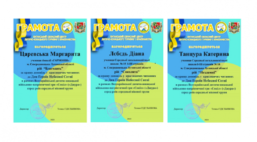 За активну участь у краєзнавчих читаннях до Дня Героїв Небесної Сотні Дипломами Луганського обласного центру дитячо-юнацького туризму і краєзнавства відмічено: Богдана Антюфєєва (СЗШ № 12), Івана Волосенко (Ліцей «ЮВЕНЕС»), Єгора Галайчкуа (СЗШ № 20), Марію Клочко (СЗШ № 6), Вероніку Мозолевську (Гімназія № 7), Лілію Нарожну (СЗШ № 20), Діану Сафонову (Ліцей «КОЛЕГІУМ»), Єлизавету Таболіну (СЗШ № 14), Анжеліку Хаблак (СЗШ № 8), Софію Чернишенко (СЗШ № 11), Артема Волкова (Ліцей багатопрофільний), Єлизавету Плешкань (Ліцей № 1), Марію Тертичну (Ліцей «ІНІТІУМ»).