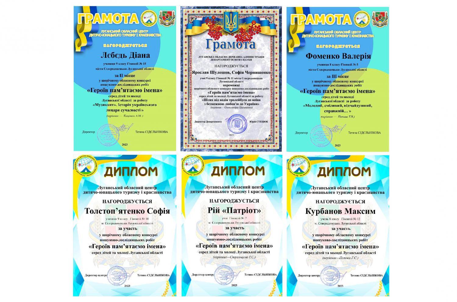 Грамотами Луганського обласного центру дитячо-юнацького туризму і краєзнавства нагороджено авторів кращих пошуково-дослідницьких робіт: