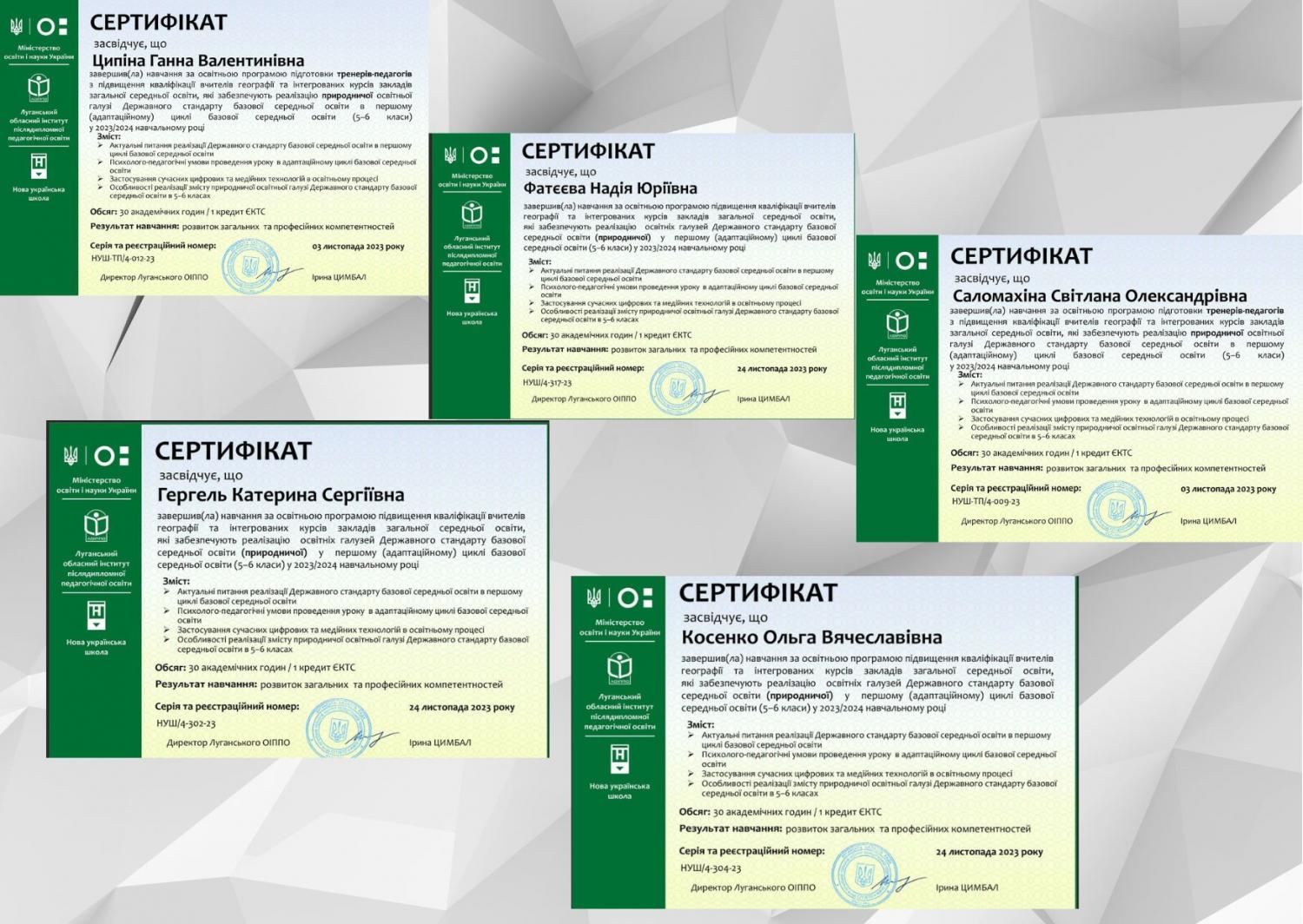 Серед них вчителі, які викладають в 5-6 класах у 2023-2024 навчальному році (Гергель К.С., вчитель Гімназії № 6, Косенко О.В., вчитель Ліцею ''Інітіум'', Фатєєва Н.Ю., вчитель Гімназії № 15) та підготовлені вчителі в якості тренерів -педагогів ( Саломахіна С.О., вчитель Ліцею «КОЛЕГІУМ» та Ципіна Г.В., вчитель Гімназії №4).