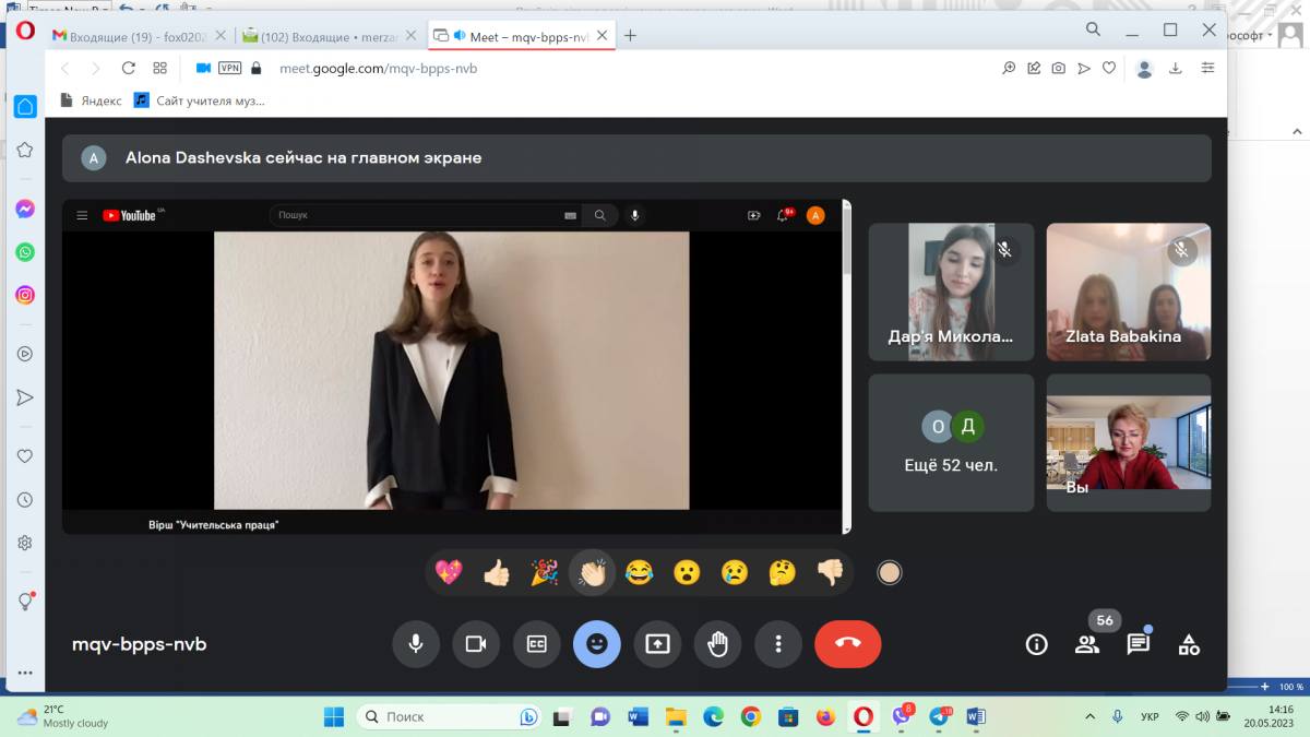 В суботу, 20 травня, в Сєвєродонецькому фаховому коледжі культури і мистецтв імені Сергія Прокоф'єва в онлайн-форматі пройшов захід, присвячений закінченню навчального року 2022-2023, на якому зібралися понад 60 осіб - учні школи педагогічної практики, їх батьки, студенти-практиканти, викладачі коледжу.