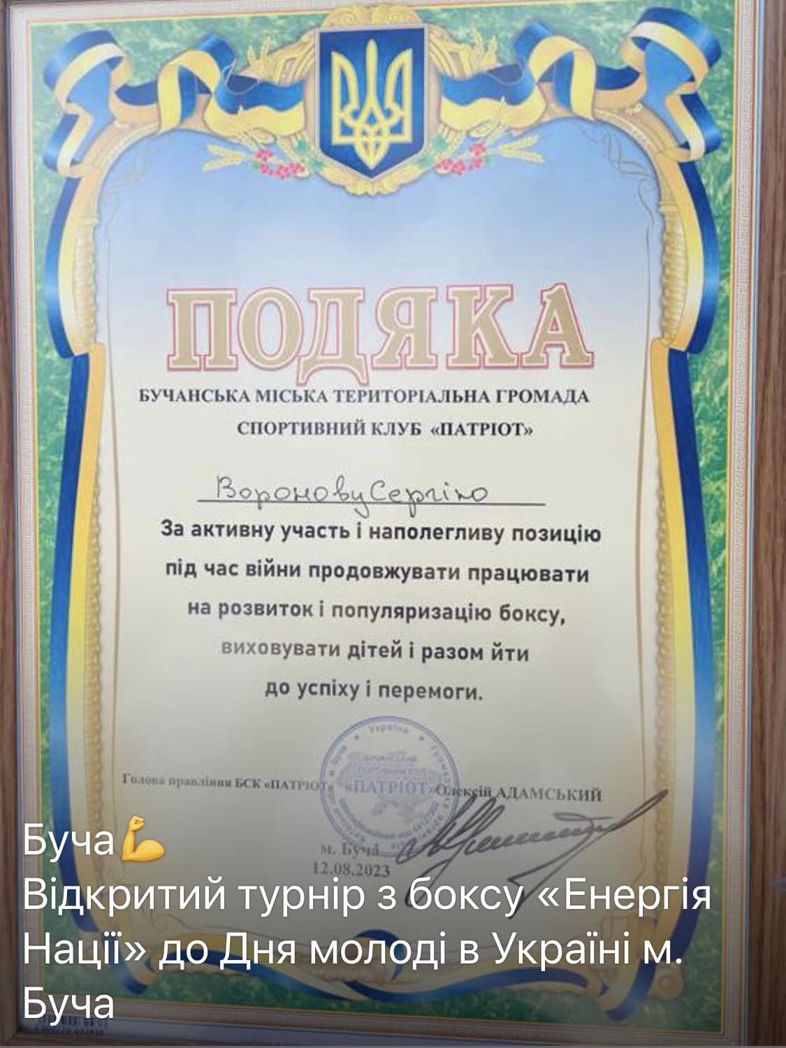 А тренер наших юних сєвєродонецьких спортсменів Сергій Воронов на турнірі від спортивного клубу "Патріот" нагороджений Подякою за активну участь і наполегливу позицію під час війни продовжувати працювати на розвиток і популяризацію боксу, виховувати дітей і разом йти до успіху і перемоги.