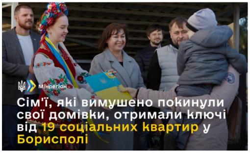 У Міністерстві розвитку громад та територій України повідомляють , що 6 жовтня у місті Бориспіль Київської області Держмолодьжитло передало багатодітним родинам, сім’ям вимушено переміщених осіб та родинам, житло яких зруйноване внаслідок бойових дій, ключі від соціальних квартир для тимчасового проживання.