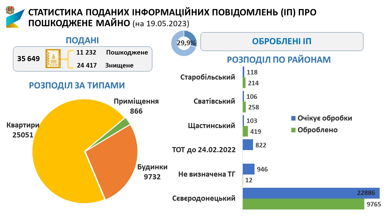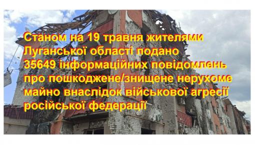 Станом на 19 травня жителями Луганської області подано 35649 інформаційних повідомлень про пошкоджене/знищене нерухоме майно внаслідок військової агресії російської федерації