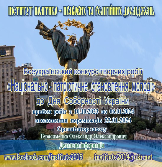 Інститут політико-правових та релігійних досліджень з нагоди відзначення Дня Соборності України проводить Всеукраїнський конкурс творчих робіт «Національно-патріотичне становлення молоді».