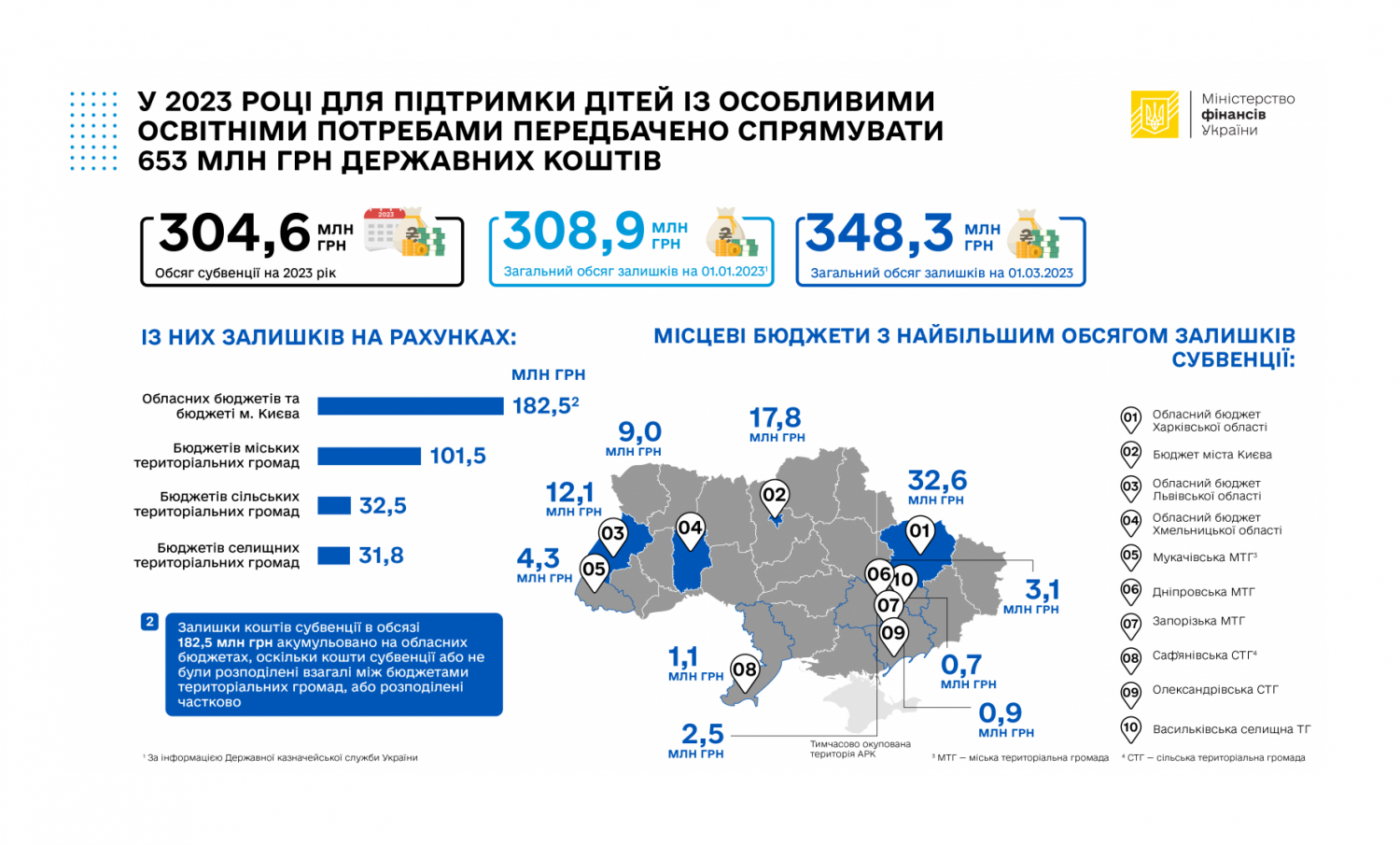 У 2023 році для підтримки дітей із особливими освітніми потребами передбачено спрямувати 653 млн грн державних коштів, - повідомляє Міністерство фінансів України . Із них для проведення психолого-педагогічних і корекційно-розвиткових занять передбачено 304,6 млн гривень державної субвенції. У січні ‒ березні 2023 року спрямовано 76,1 млн грн субвенції, або 100% помісячних призначень.