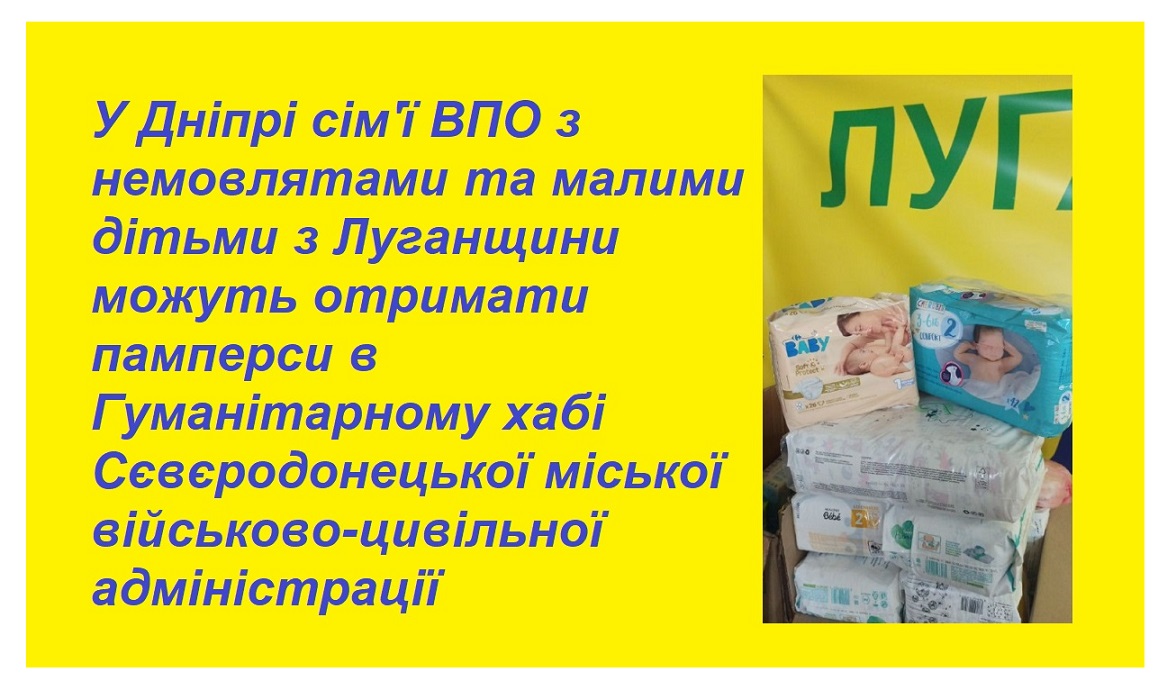 У Дніпрі сім'ї ВПО з немовлятами та малими дітьми з Луганщини можуть отримати памперси в Гуманітарному хабі Сєвєродонецької міської ВЦА
