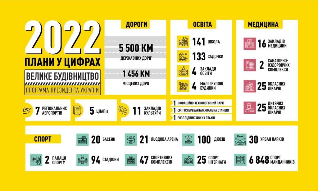 Цьогоріч у межах програми «Велике будівництво» мають звести 20 басейнів, 94 стадіони, 47 спортивних комплексів, два палаци спорту, реконструювати 100 ДЮСШ, 25 спортивних інтернатів, створити 21 льодову арену й 30 урбан-парків у 30 містах.