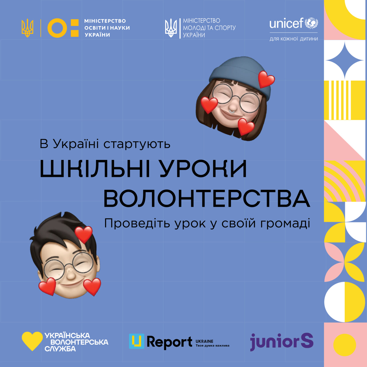 ГО «Українська Волонтерська Служба» спільно з ГО «Рух Олександра Педана "JuniorS"» за підтримки Дитячого фонду ООН (ЮНІСЕФ) в Україні, Міністерства освіти і науки та Міністерства молоді та спорту ініціювала новий проєкт, що сприятиме обізнаності про важливість волонтерської діяльності.