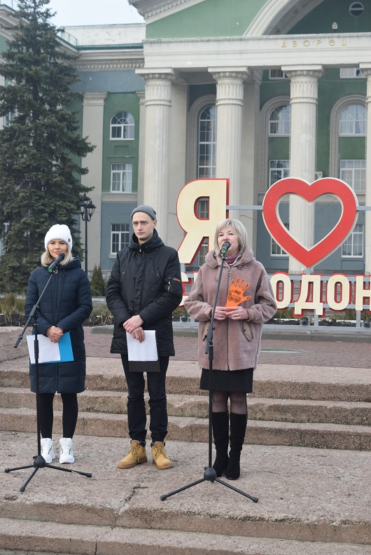 Заступник міського голови, голова міської координаційної ради з питань сім’ї, гендерної рівності, демографічного розвитку, запобігання домашньому насильству та протидії торгівлі людьми Ірина Степаненко звернулася до учасників акції: «Більше двох тижнів Україною крокує акція «16 днів проти насильства». І ми, українці, кажемо «Ні насильству в будь-яких проявах!» Насильству психологічному, фізичному, проти дітей, проти жінок та чоловіків – ми кажемо «Ні!» І сьогодні символічними долонями та кульками помаранчевого кольору, який Організація об’єднаних націй обрала кольором привернення уваги до протидії насильству, сєвєродончани підтримують ідею нестерпного ставлення до насильства. Бажаю всім ніколи не стикатися з насильством, а у разі виявлення таких проявів – звертатися до поліції, бо вона разом з нами і допоможе нам. Бажаю вам здоров’я, мирного неба та щоб ви завжди були щасливими!»