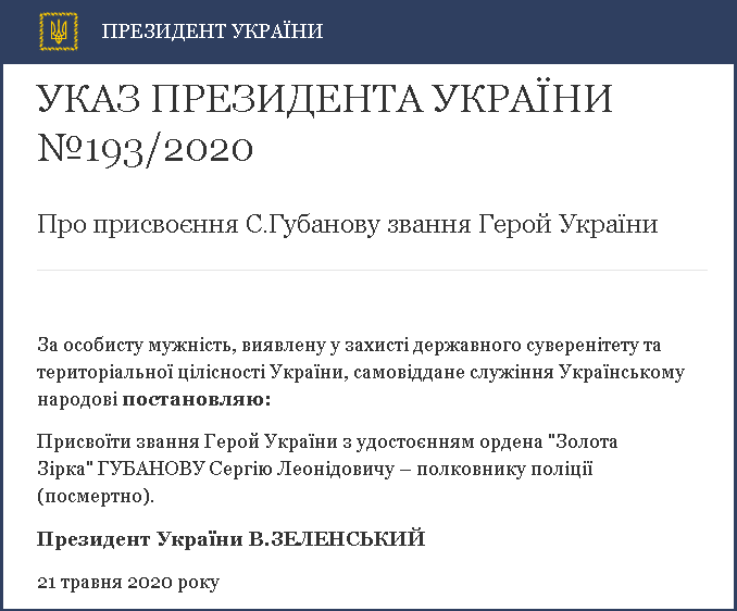 Указом Президента України від 21 травня полковнику поліції Сергію Губанову присвоєно звання Героя України з врученням ордена «Золота Зірка» (посмертно).