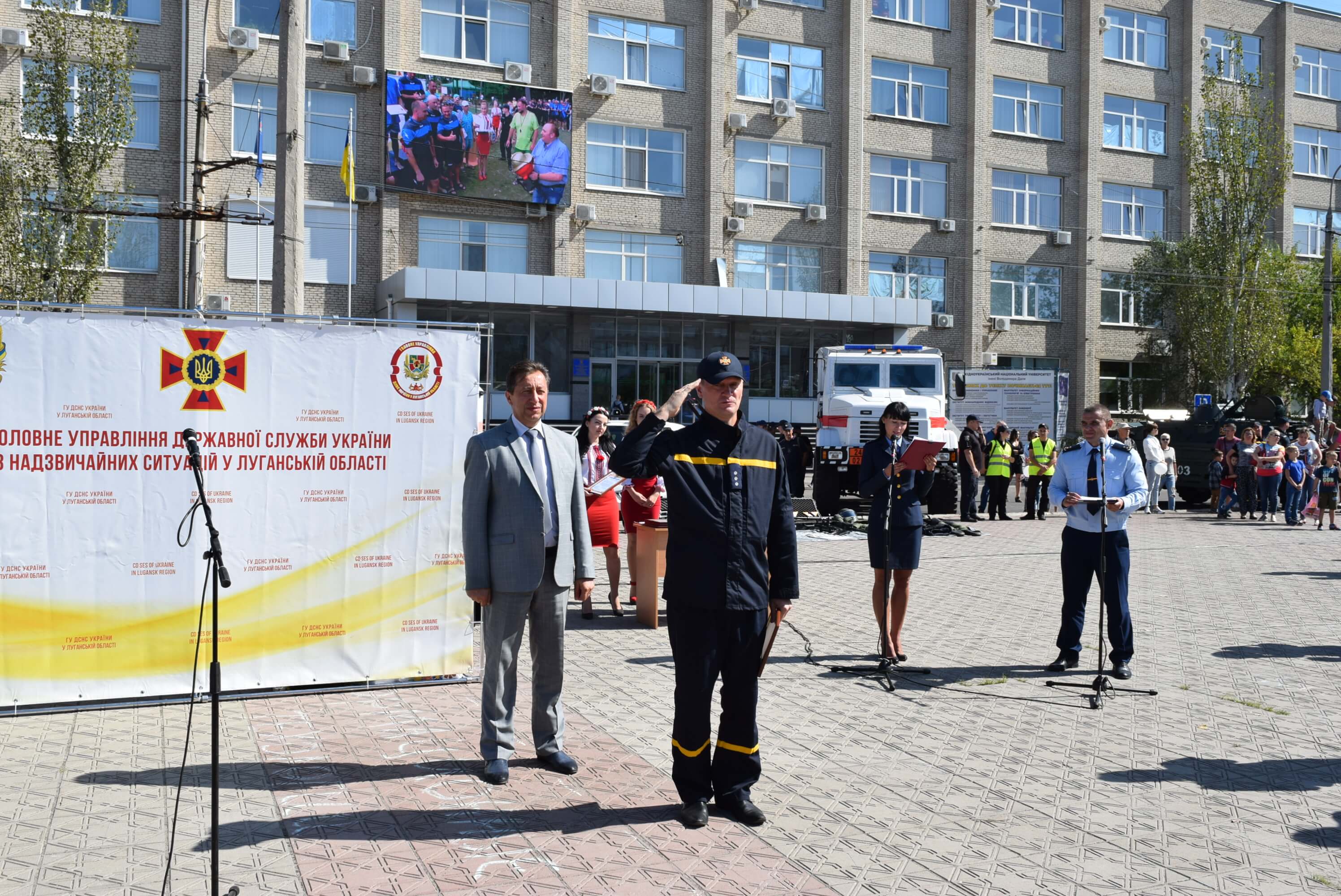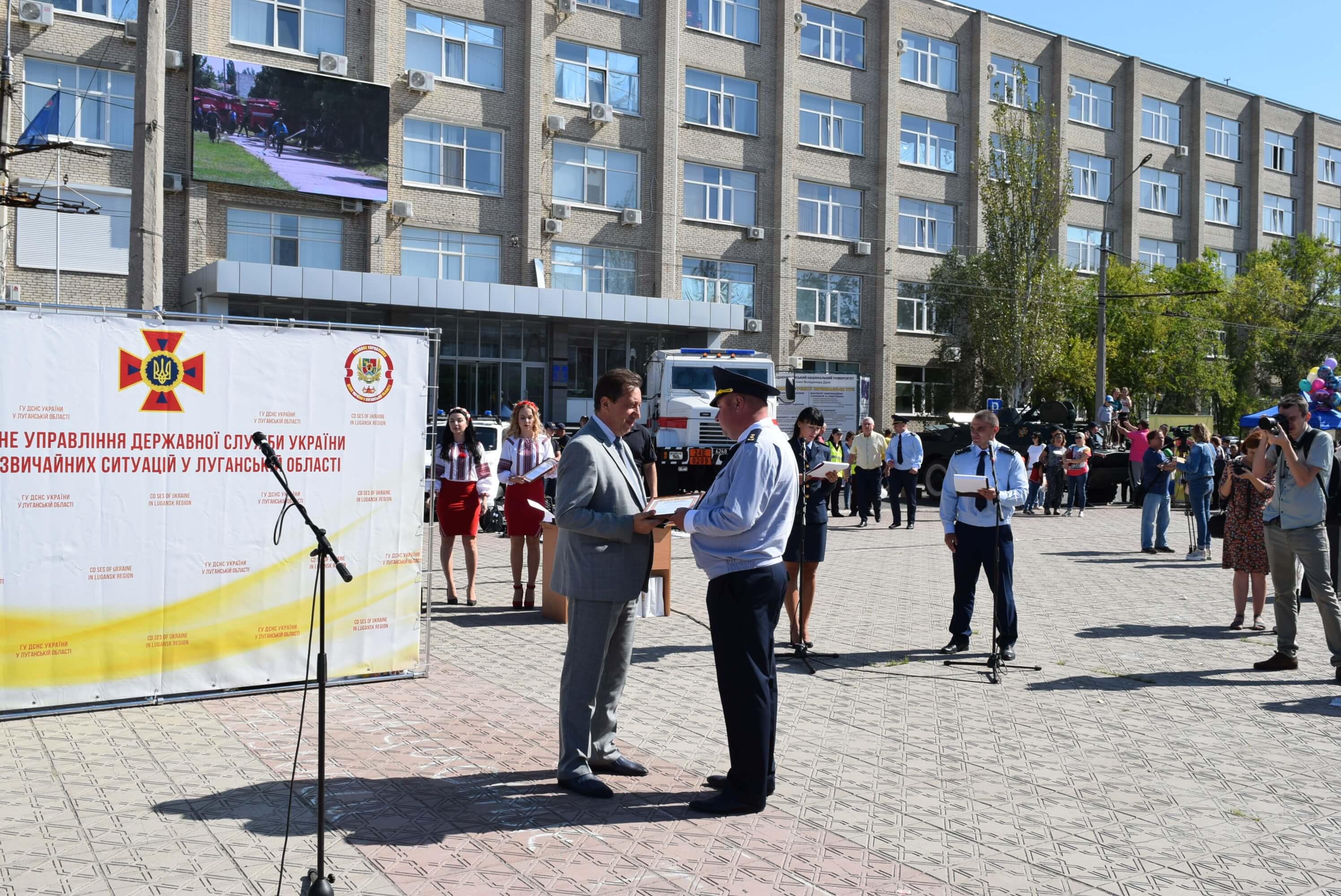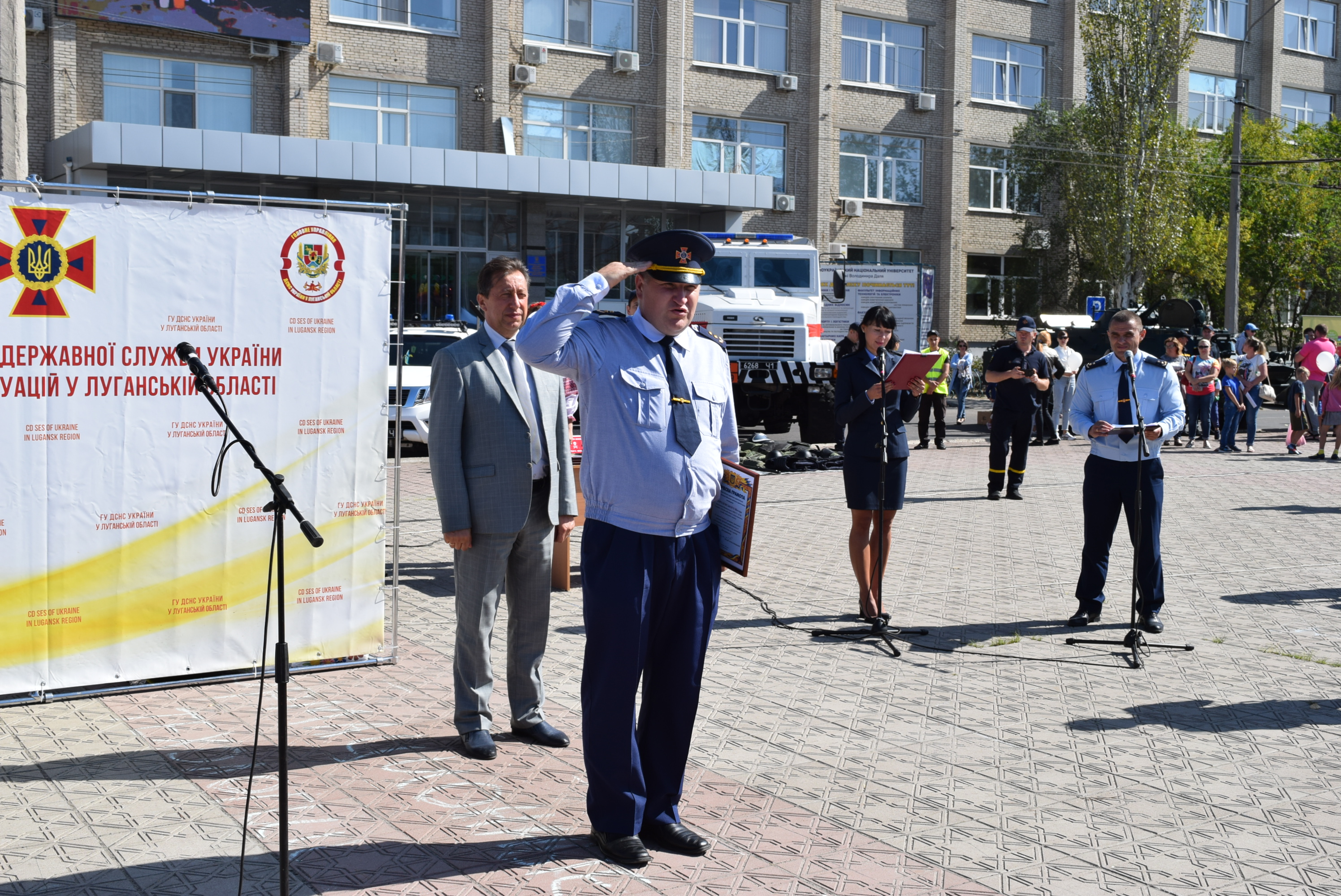 Від обласної влади рятівників привітав голова Луганської обласної державної адміністрації – керівник обласної військово-цивільної адміністрації Віталій Комарницький: «Шановні рятувальники, коли ми кажемо про вашу професію, то це, мабуть, образ та стиль життя, адже саме вам в самі тяжкі хвилини для людей приходиться приходити на допомогу. Щира вдячність вам за вашу працю та ваш щоденний подвиг! Тільки з початку року вами ліквідовано 1479 пожежних ситуацій. Ви спасли 26 життів. Вами розміновано 850 вибухонебезпечних предметів. Тому бажаю усім нам миру і стабільності, а вам – професійної та людської стійкості і надійності! Зі святом!»
