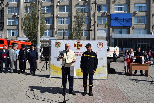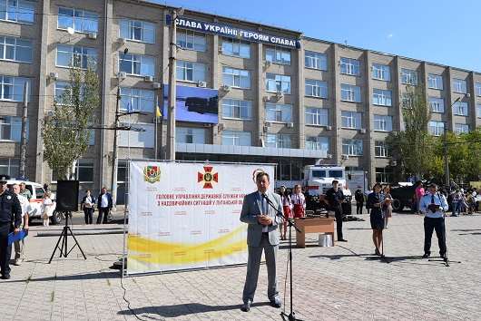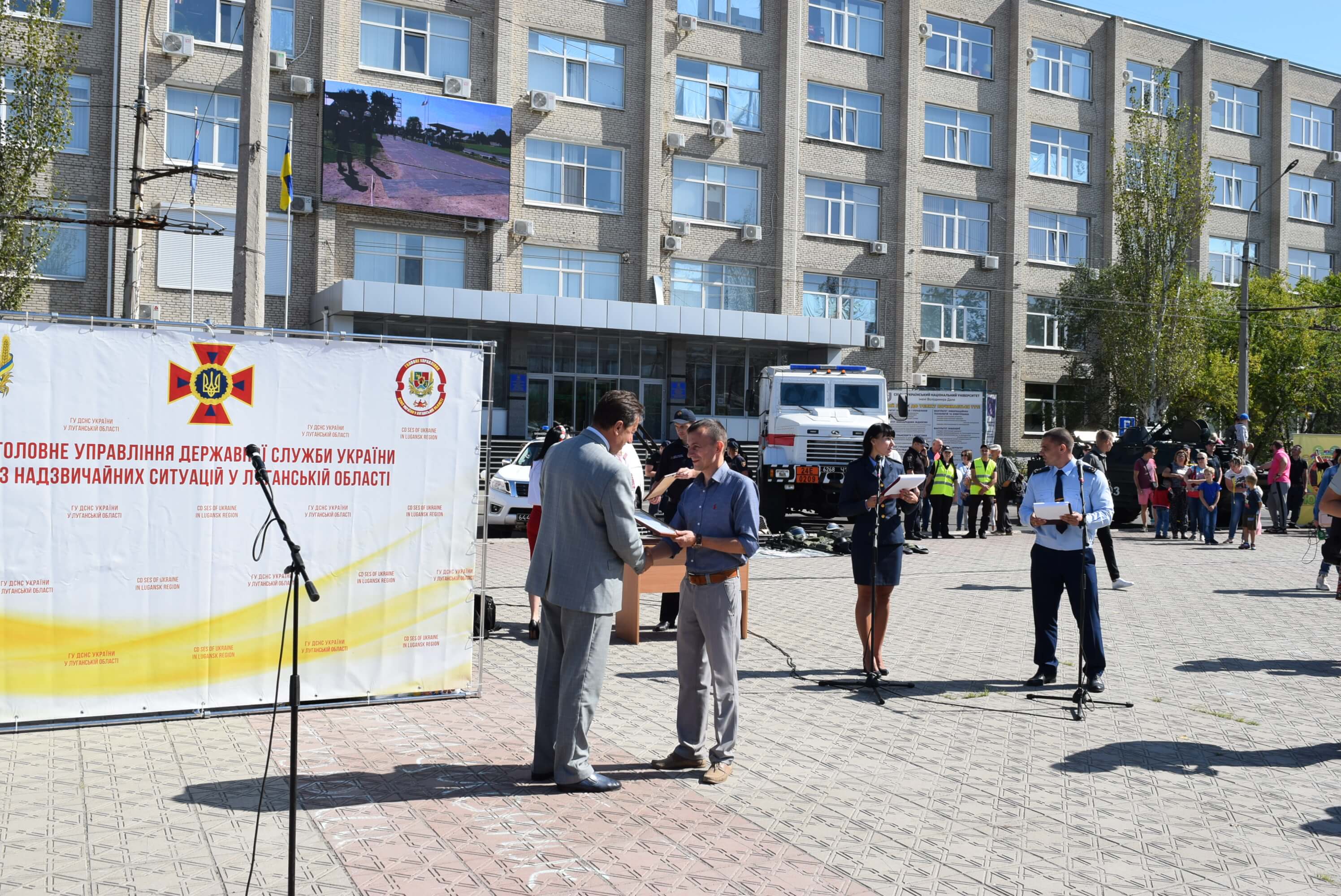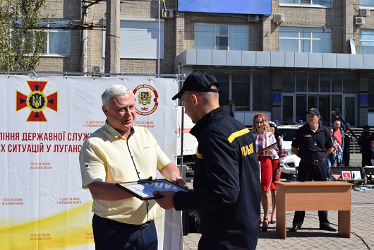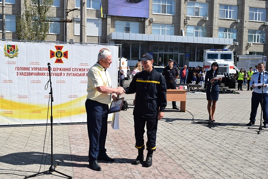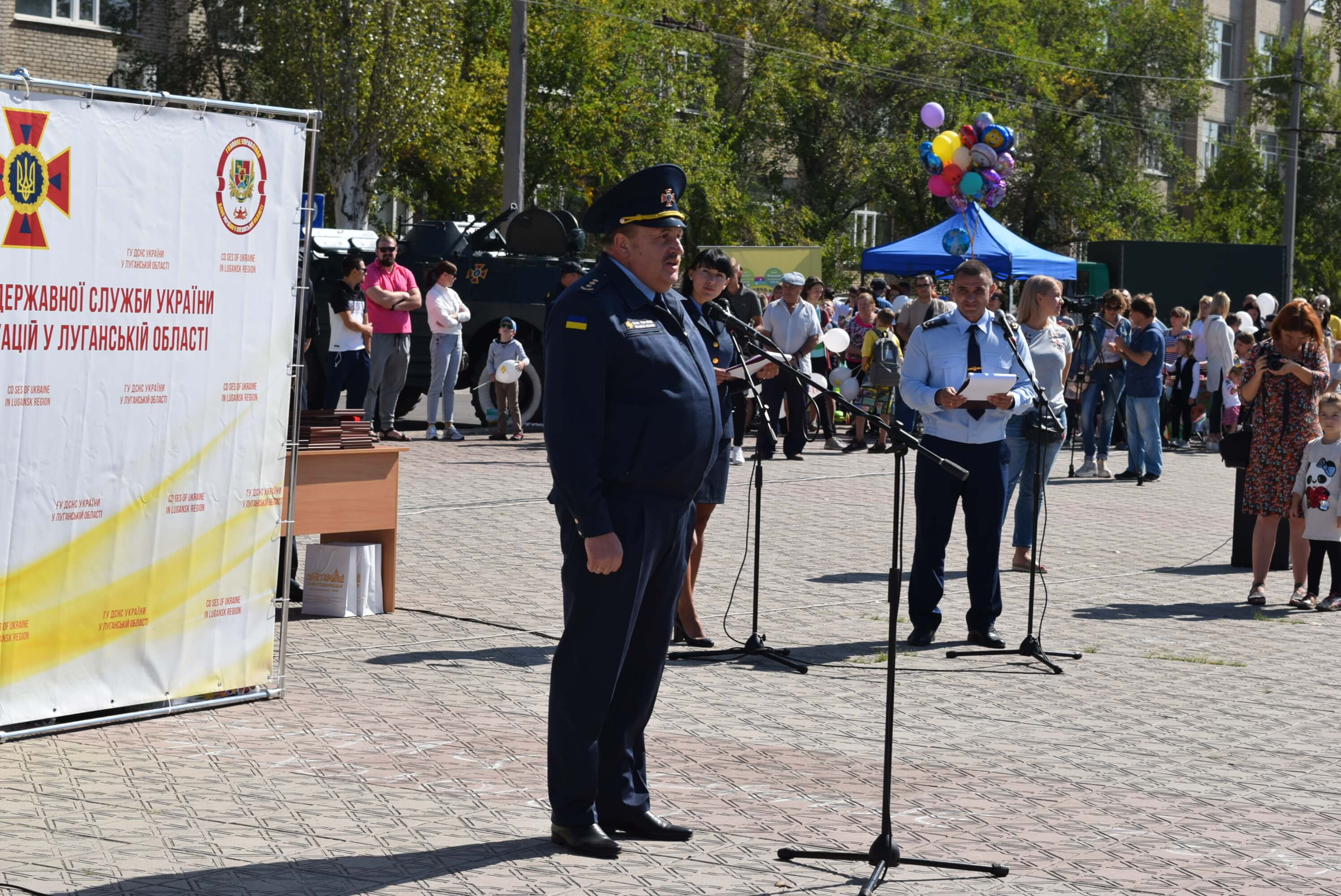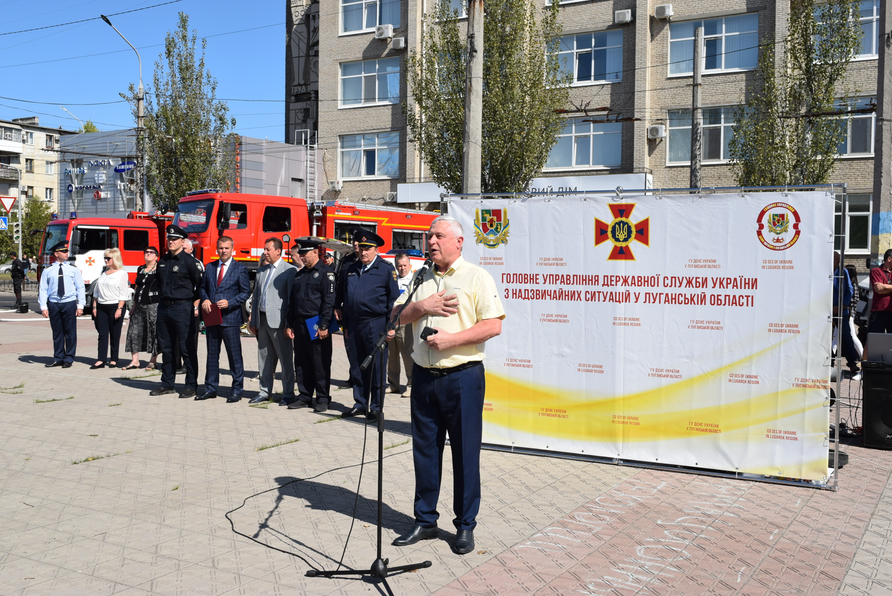 Від обласної влади рятівників привітав голова Луганської обласної державної адміністрації – керівник обласної військово-цивільної адміністрації Віталій Комарницький: «Шановні рятувальники, коли ми кажемо про вашу професію, то це, мабуть, образ та стиль життя, адже саме вам в самі тяжкі хвилини для людей приходиться приходити на допомогу. Щира вдячність вам за вашу працю та ваш щоденний подвиг! Тільки з початку року вами ліквідовано 1479 пожежних ситуацій. Ви спасли 26 життів. Вами розміновано 850 вибухонебезпечних предметів. Тому бажаю усім нам миру і стабільності, а вам – професійної та людської стійкості і надійності! Зі святом!»