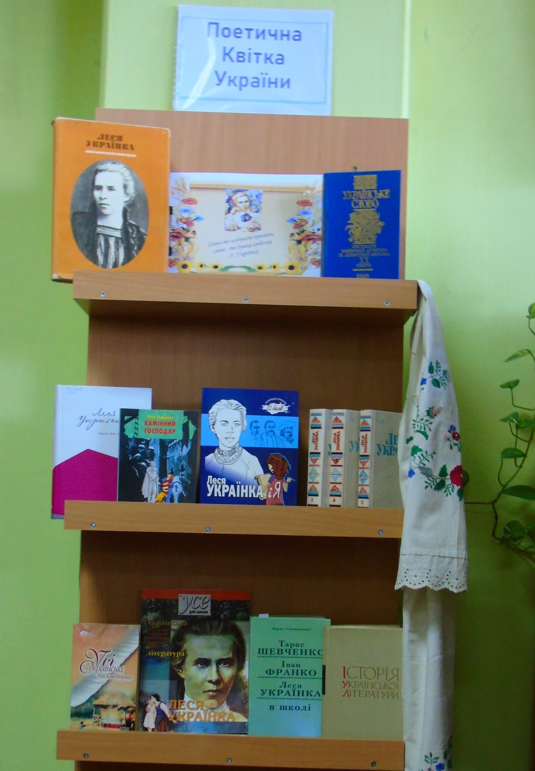До ювілею поетеси ]]>в бібліотеці Сєвєродонецького міського палацу культури оформлена книжкова виставка «Поетична квітка України»]]>. На цій виставці усі охочі мають змогу ознайомитись із творчістю Лесі Українки та її біографією.