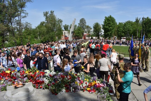 Потім учасники мітингу, сформувавши колону, пам'ятною ходою рушили до Меморіалу Слави, де відбулися панахида за загиблими у Другій світовій війні та урочисте покладання квітів до Братської могили.