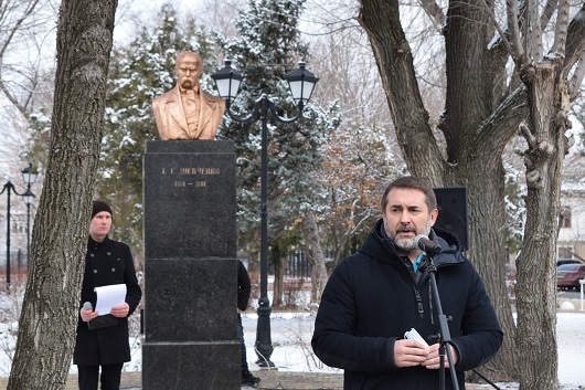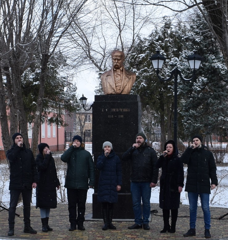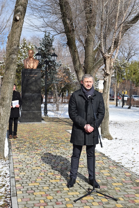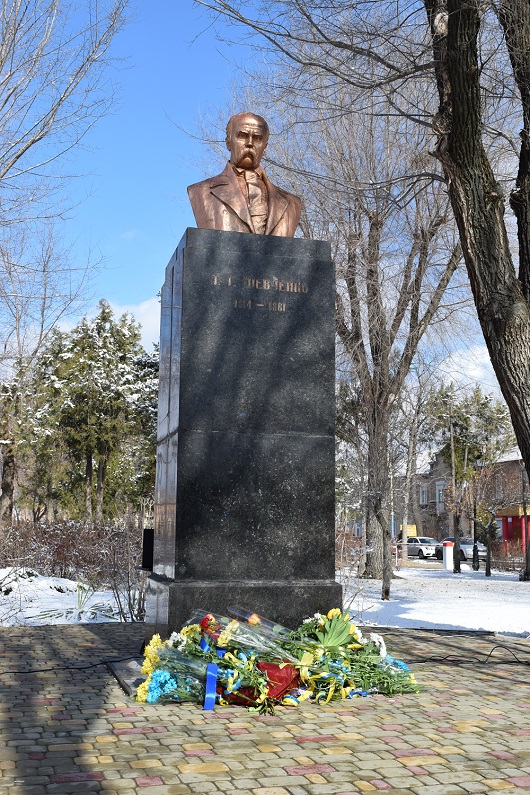 Потім учасники заходу доєдналися до читання вголос уривку вірша Тараса Шевченка «До Основ’яненка» та поклали квіти до погруддя великого Кобзаря.
