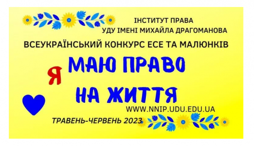 Навчально-науковий інститут права та політології Українського державного університету імені Михайла Драгоманова у травні-червні 2023 року за підтримки Міністерства культури та інформаційної політики України проводить Всеукраїнський конкурс есе та малюнків «Я маю ПРАВО на життя».