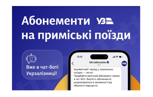 Придбати абонементи на місячний проїзд приміськими рейсами в Київській, Житомирській, Чернігівській, Вінницькій, Хмельницькій, Сумській, Черкаській, Кіровоградській, Миколаївській та Одеській областях можна у чат-боті Укрзалізниці в усіх месенджерах.