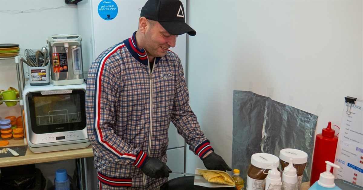 Уроженець Сєвєродонецька Юрій Свєтличний готує млинці з ностальгією за рідним Луганськом. Він відкрив в Києві “БлінОК”