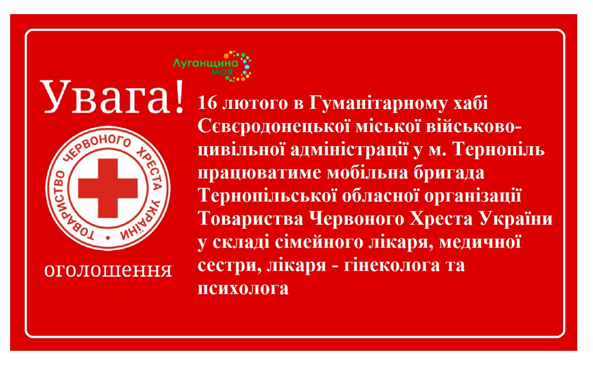 16 лютого в Гуманітарному хабі Сєвєродонецької міської військово-цивільної адміністрації “Луганщина Моя” за адресою: м. Тернопіль, вул. Грушевського, 5а., з 10-00 до 14-00 буде працювати мобільна бригада Тернопільської обласної організації Товариства Червоного Хреста України за підтримки Товариства Червоного Хреста Норвегії у складі сімейного лікаря, медичної сестри, лікаря - гінеколога та психолога.