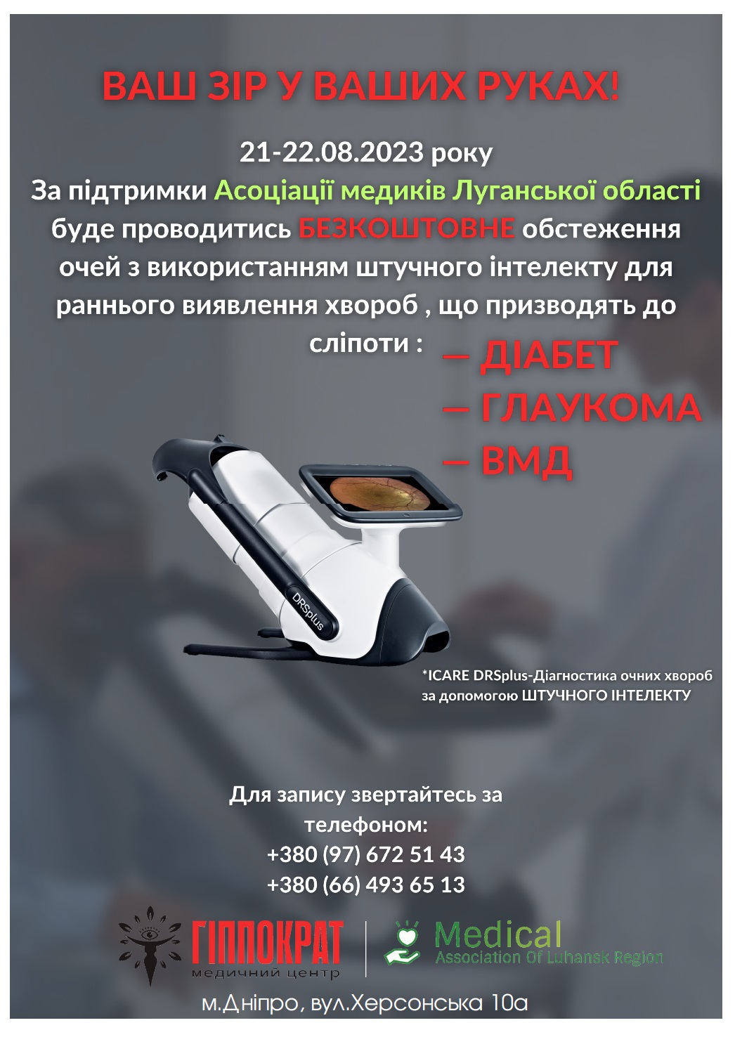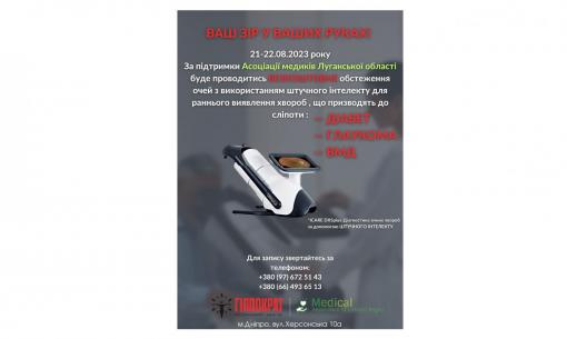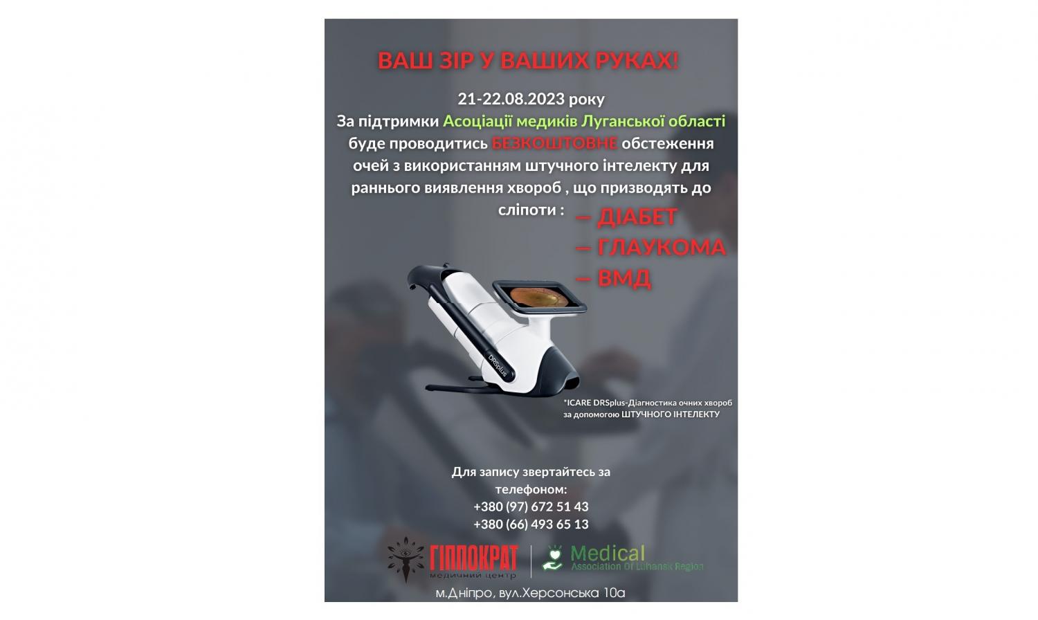 УВАГА! 21-22 серпня в МЦ "ГІППОКРАТ" у Дніпрі за підтримки Асоціації медиків Луганської області можна провести безкоштовне обстеження очей з використанням штучного інтелекту