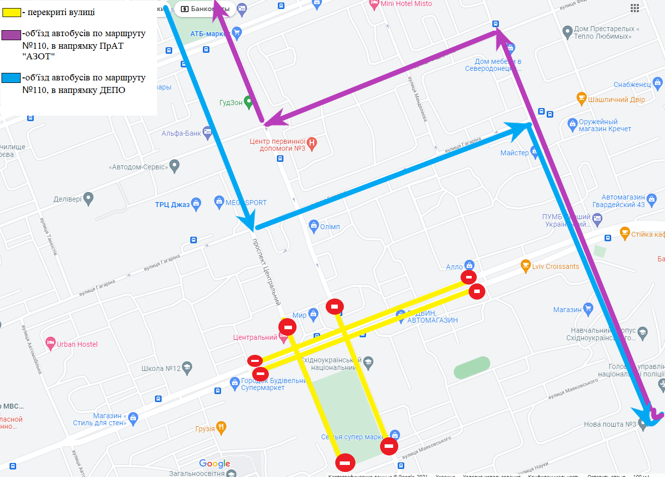 Для виконання робіт з ремонту контактної мережі комунального підприємства «Сєвєродонецьке тролейбусне управління» на ділянці проспекту Гвардійський відповідно до схеми буде тимчасово перекрито дорожній рух в ніч на 24.12.2021р. до 05.00. годин 28.12.2021р.