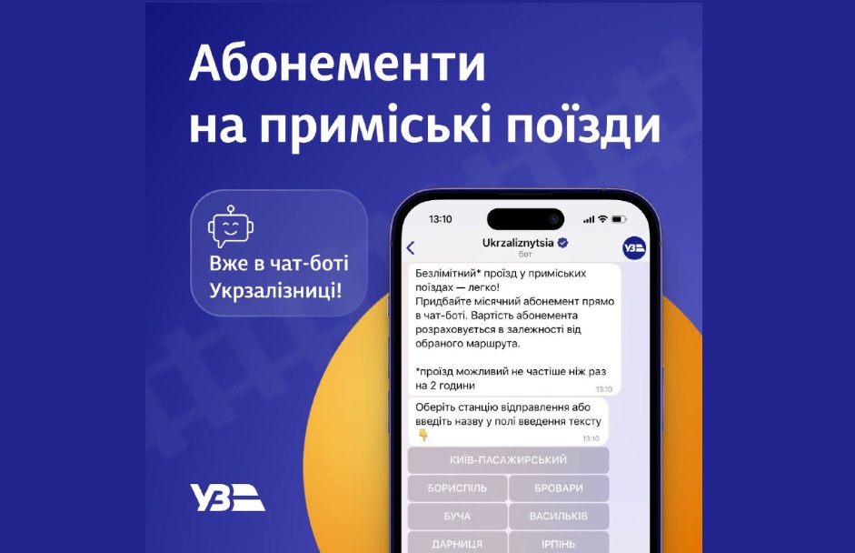 Відсьогодні в чат-боті Укрзалізниці у всіх месенджерах можна придбати абонементи на місячний проїзд приміськими рейсами у Київській, Житомирській, Чернігівській, Вінницькій, Хмельницькій, Сумській, Черкаській, Кіровоградській, Миколаївській та Одеській областях.