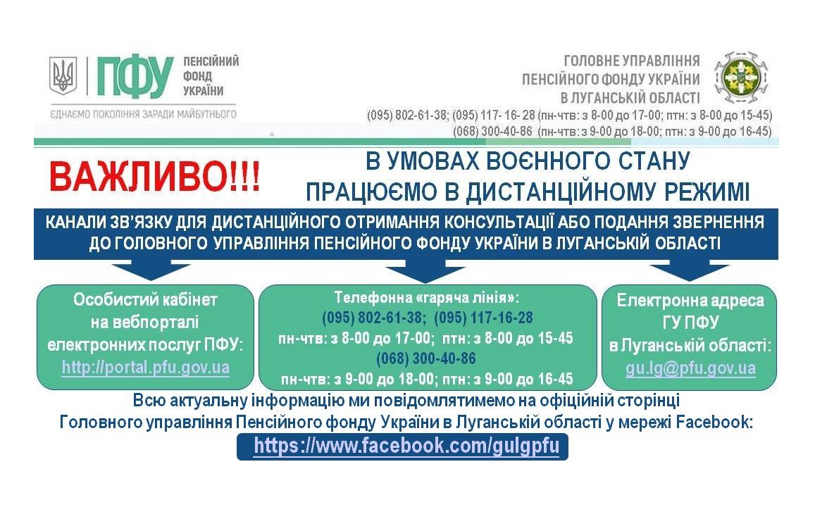 Звернутись за роз’ясненням до Головного управління Пенсійного фонду України в Луганській області можна і через особистий кабінет на вебпорталі електронних послуг Пенсійного фонду України, який працює цілодобово за посиланням http://portal.pfu.gov.ua.