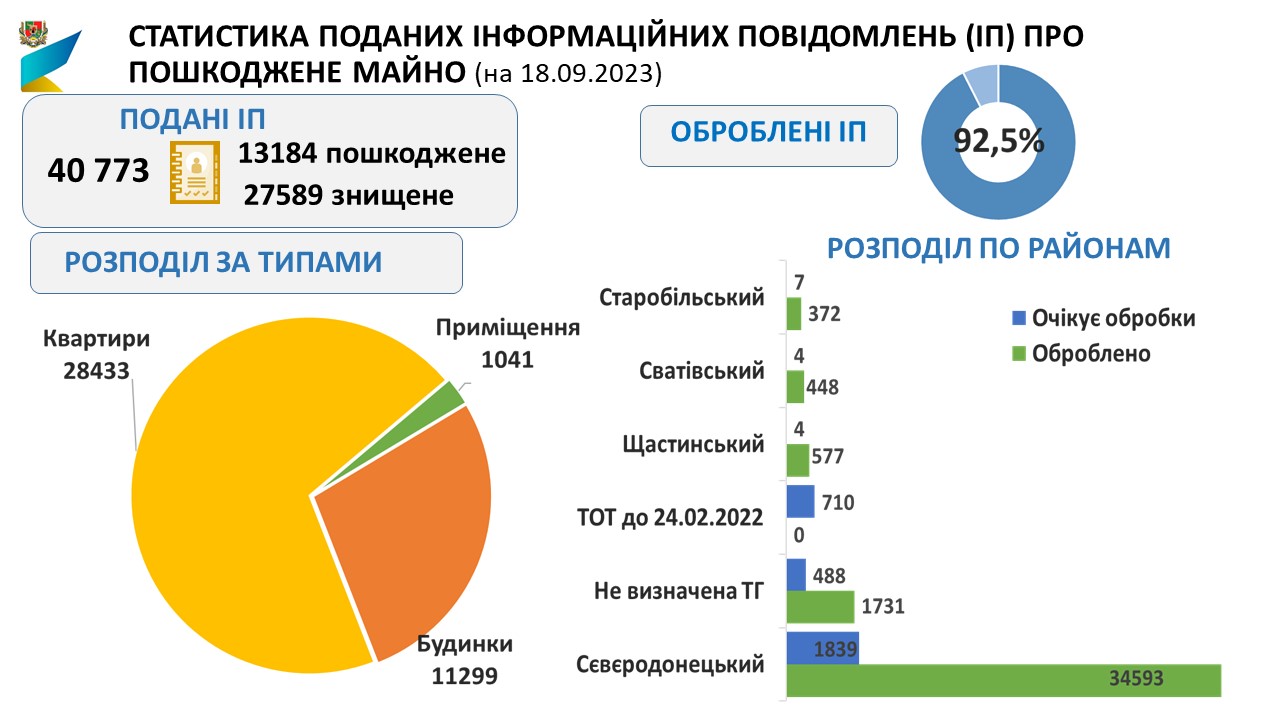 Департамент економічного розвитку та зовнішньоекономічної діяльності ЛОДА інформує , що станом на 18.09.2023 в Луганській області подано 40773 інформаційних повідомлень (ІП) про пошкоджене/знищене нерухоме майно.
