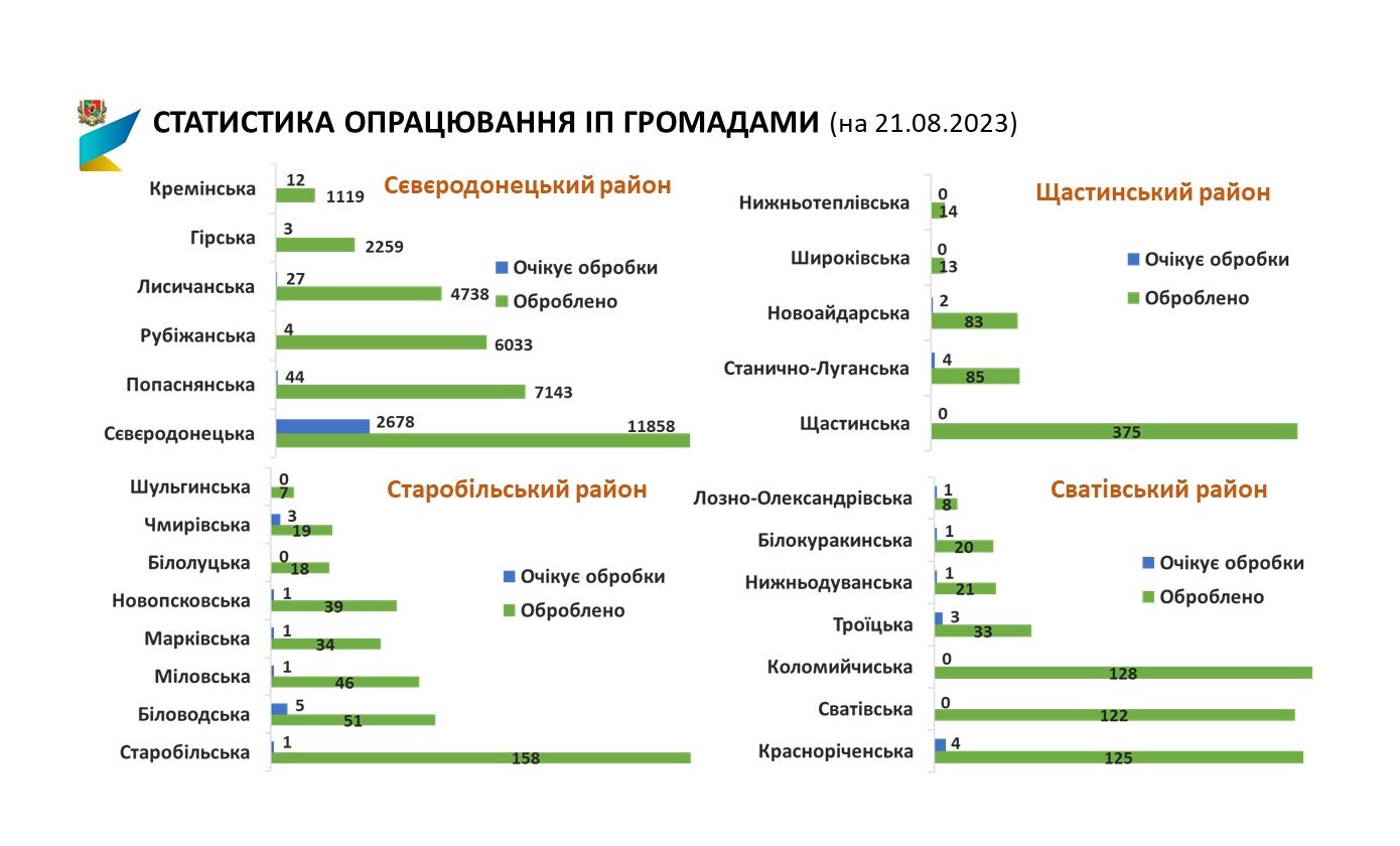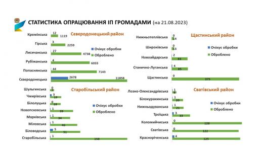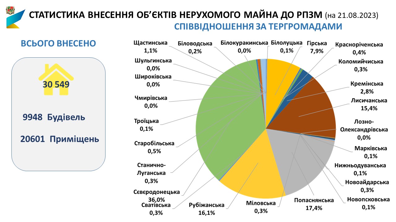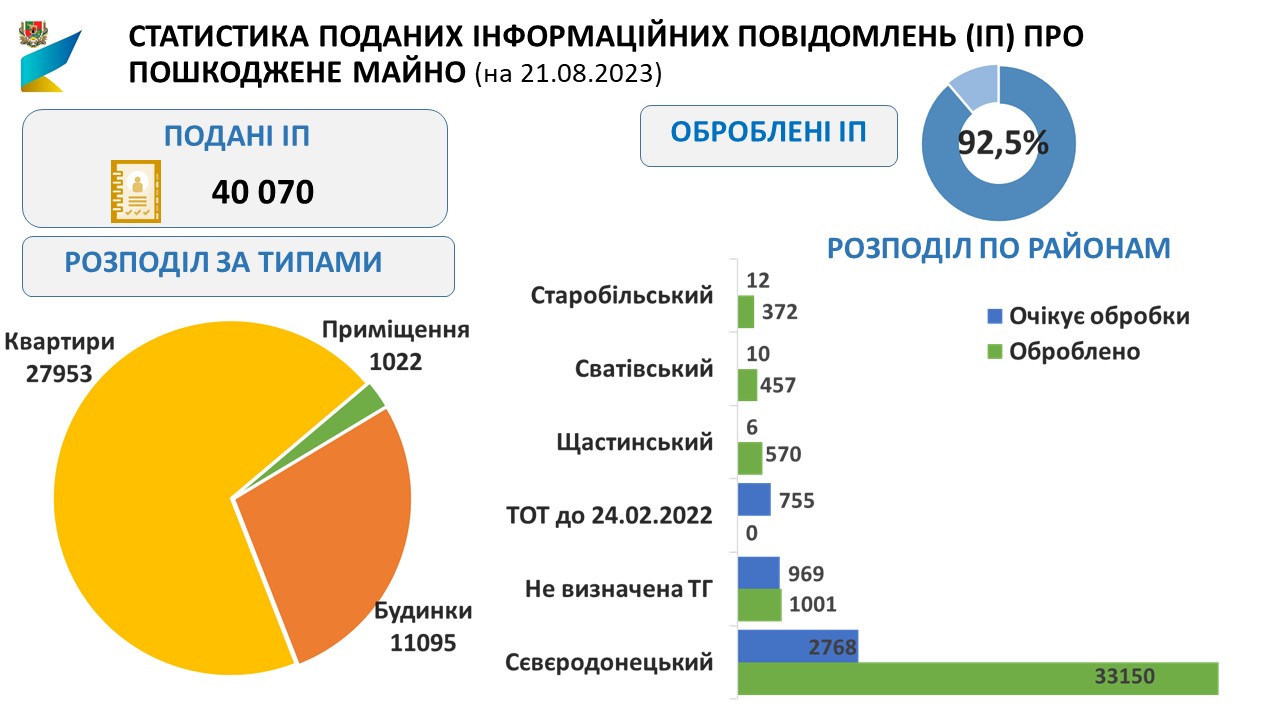 Станом на 21.08.2023 в Луганській області подано 40070 інформаційних повідомлень (ІП) про пошкоджене/знищене нерухоме майно.