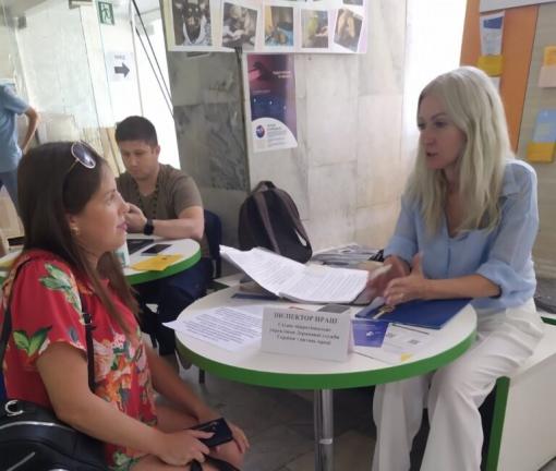 Заступник начальника управління – начальник відділу контролю з питань праці східного напрямку управління інспекційної діяльності у Луганській області – Яна Драган 09 серпня 2023 року в Гуманітарному хабі Сєвєродонецької міської військової адміністрації у місті Дніпро надала консультації внутрішньо переміщеним мешканцям Луганщини щодо особливостей дії законодавства про працю під час воєнного стану, а також проінформувала громадян про основні ризики потрапляння у ситуації торгівлі людьми.