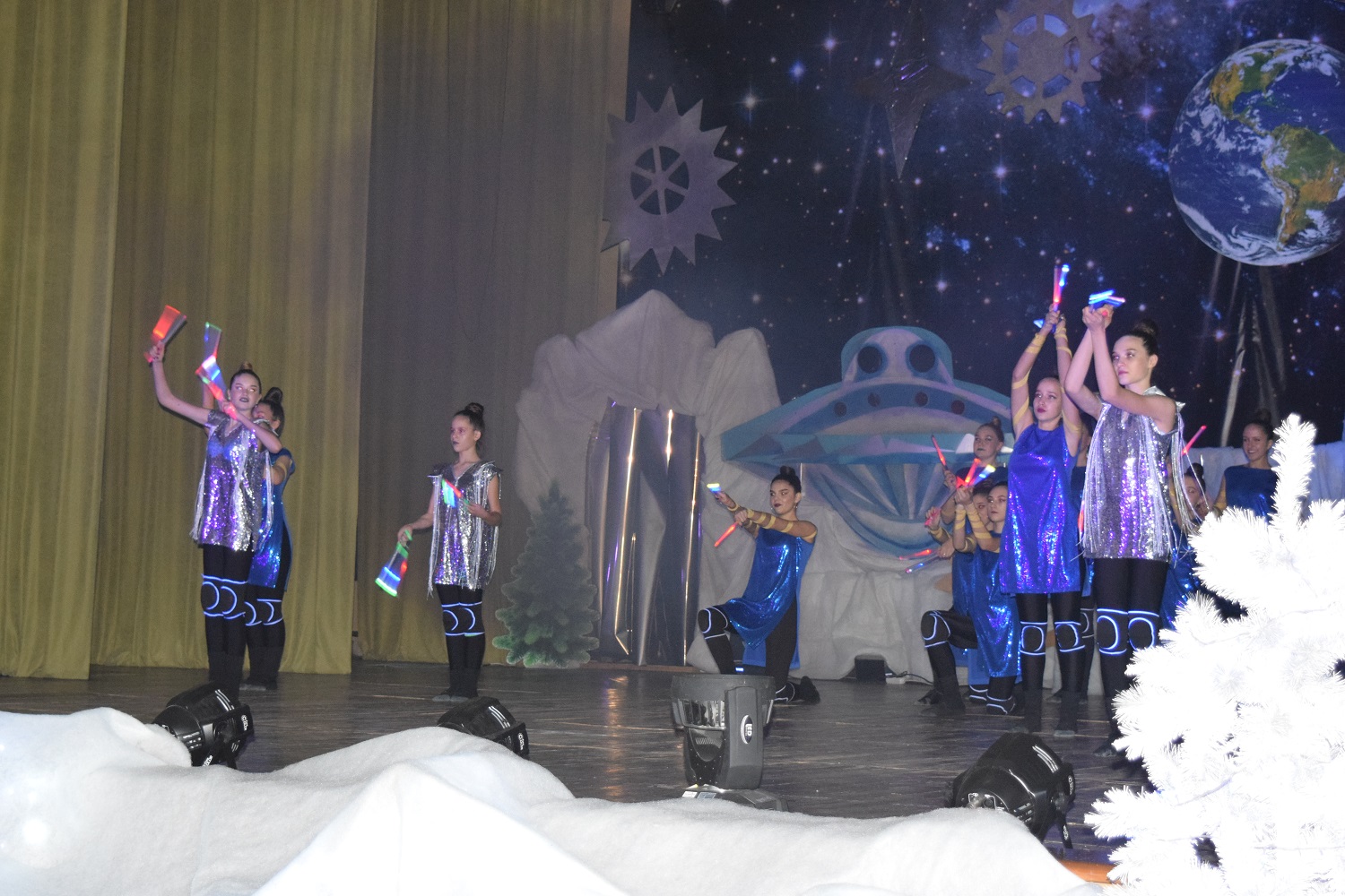 На увагу глядачів було представлене яскраве захоплююче театралізоване інтерактивне шоу зі спецефектами, запальними танцями, акробатичними трюками, чудовими костюмами і музикою під назвою «НОВОРІЧНІ ПРИГОДИ ВСЕСВІТУ». В мюзиклі головні герої Оля та Василь разом з друзями-ельфами мандрують казковими країнами Всесвіту, щоб врятувати Новорічне свято – таке дійство представили актори творчих колективів: театр юного глядача (кер. Олександр Бірюстюков), НАБТ «Евріка» (кер. Сергій Кулаков), ЗАЕТ «Талісман» (кер. Наталія Караченцева), ЗАБТ «Мрія» (кер. Віра Кулакова), НАЕП «Луч» (кер. Олена Нежибовська), КСХ «Dkdance» (кер. Яна Кормило), ВК «Перлина» (кер. Дар’я Носаль), театр ляльок «Оле Лукойє» (кер. Галіна Бичкова), режесер-постановник Тетяна Лукашова та команда техзабезпечення (див. світлини).