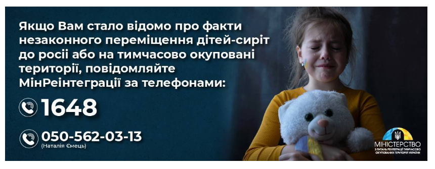 Кожен, хто має будь-яку інформацію про незаконне вивезення дітей до рф, може зателефонувати до НІБ на цілодобову гарячу лінію 16-48 та до Департаменту кризового реагування Мінреінтеграції: 050-562-03-13.