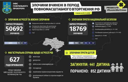 Зареєстровано 50 297 злочинів агресії та військових злочинів. З них 48 507 – з порушеннями законів і звичаїв війни, 73 – з плануванням, підготовкою або розв’язанням і веденням агресивної війни, 40 – з пропагандою війни, 1577 – інші злочини.