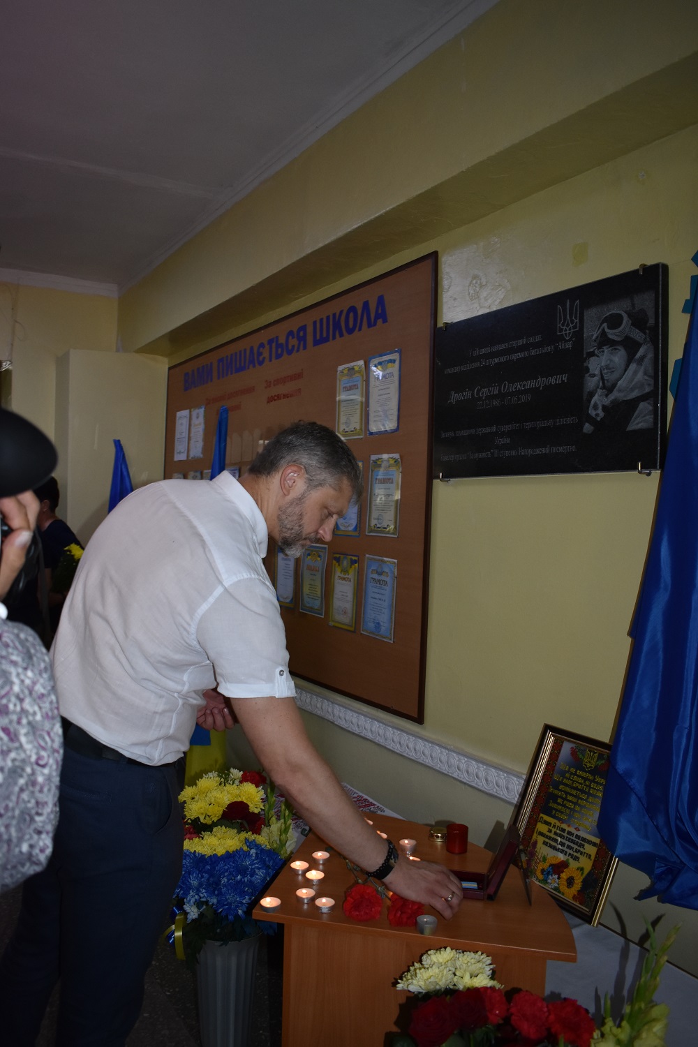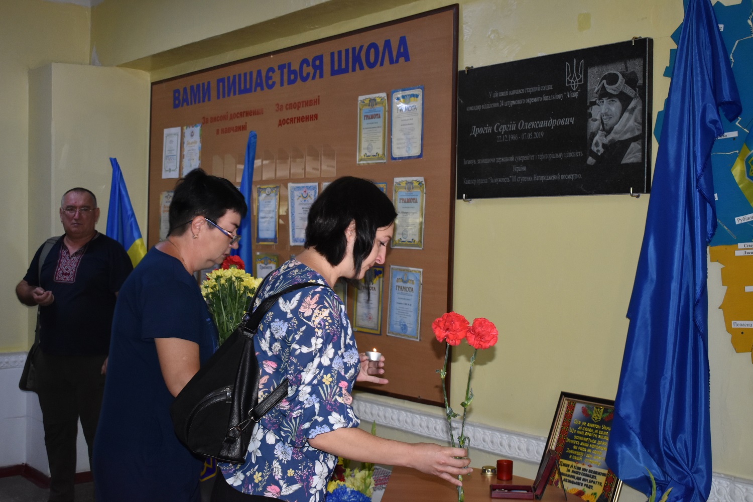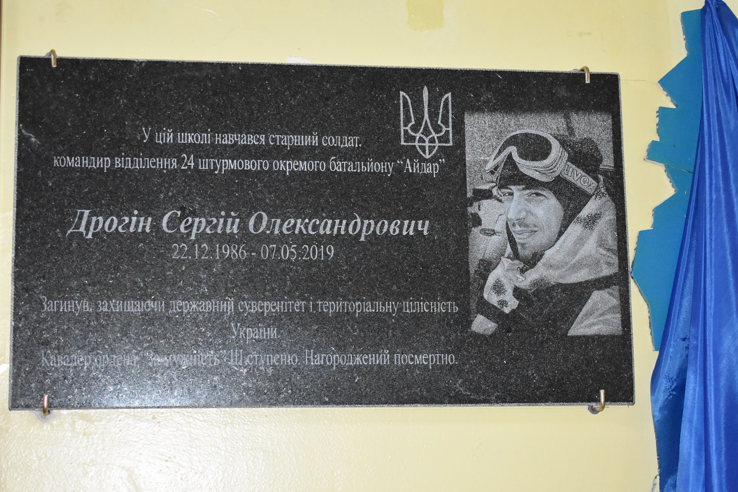 Старшому солдату, командиру відділення 24-го штурмового окремого батальйону «Айдар» Сергію Дрогіну пам’ятну дошку встановили в приміщенні загальноосвітньої школи № 20, в якій той навчався.