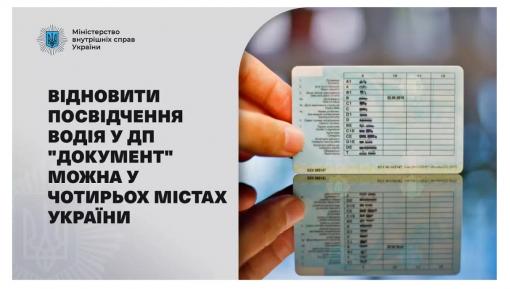 Відтепер у чотирьох містах України - Києві, Львові, Одесі та Дніпрі відновлення посвідчення водія у зв’язку з втратою чи викраденням доступне не лише у сервісних центрах МВС. Наші громадяни мають можливість отримати цю послугу у Паспортному сервісі ДП "Документ".