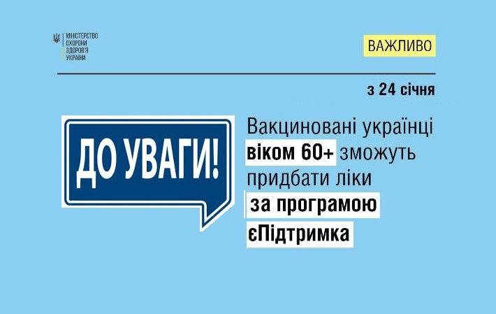 З 24 січня вакциновані українці від 60 років можуть придбати лікарські засоби за кошти, отримані у межах президентської програми єПідтримка.