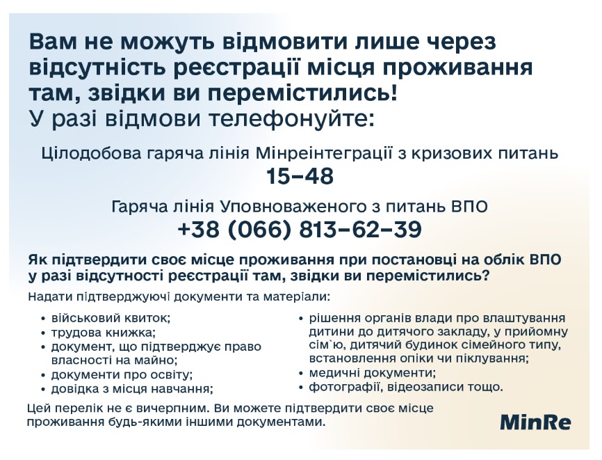 Наголошуємо: чинним законодавством передбачено, що відсутність такої реєстрації не може бути підставою для відмови у видачі довідки ВПО.