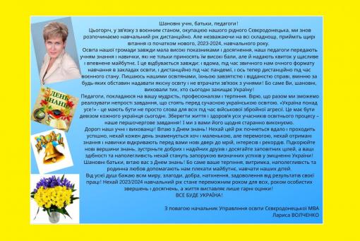 Дорогі наші учні і вихованці! Вітаю з Днем знань! Нехай цей рік почнеться вдало і проходить успішно, нехай кожен день знаменується хоч і маленькою, але перемогою, нехай отримані знання і навички відкривають перед вами нові двері до мрій, інтересів і рекордів. Підкорюйте нові вершини знань, зустріньте добрих і надійних друзів і досягайте заповітних цілей, а ваші здібності та наполегливість нехай стануть запорукою визначних успіхів у зміцненні України!
