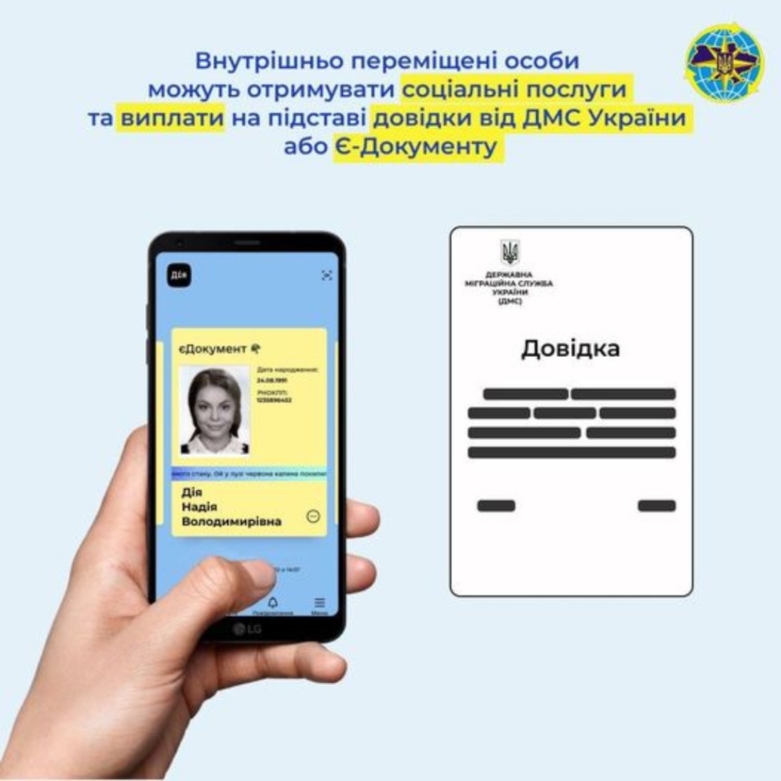 Внутрішньо переміщені особи можуть отримувати соціальні послуги та виплати на підставі довідки від ДМС України або Є-Документу