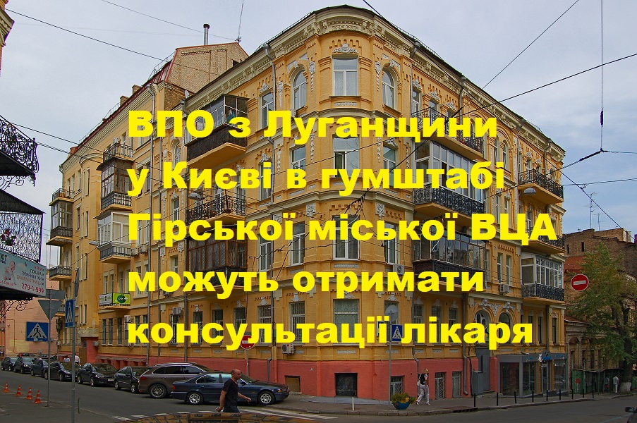 Відтепер внутрішньо переміщені особи з Луганщини, які тимчасово мешкають у Києві та області, матимуть змогу отримати медичні консультації у Гуманітарному штабі Гірської міської військово-цивільної адміністрації за адресою: місто Київ, вулиця Мала Житомирська, 16/3 (біля Майдану Незалежності).