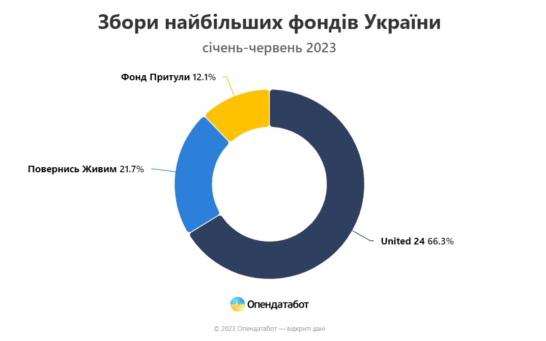 Основну частину донатів за перше півріччя зібрала платформа United24 — 5,54 млрд гривень або 66% від загального обсягу. На рахунки фонду «Повернись живим» надійшло 1,81 млрд гривень (22%), а до фонду Сергія Притули — близько 1 млрд гривень (12%).
