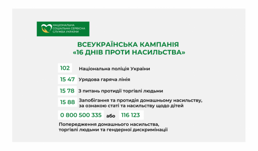 За інформацією: Національна соціальна сервісна служба України - https://nssu.gov.ua/news/vseukrainska-kampaniia-16-dniv-proty-nasylstva