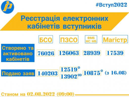 Крім того, подано майже 177,5 тис. електронних заяв випускниками 9-х і 11-х класів, а також вступниками на основі диплома фахового молодшого бакалавра, молодшого бакалавра чи молодшого спеціаліста. Подання заяв для вступу до магістратури розпочнеться 16 серпня.