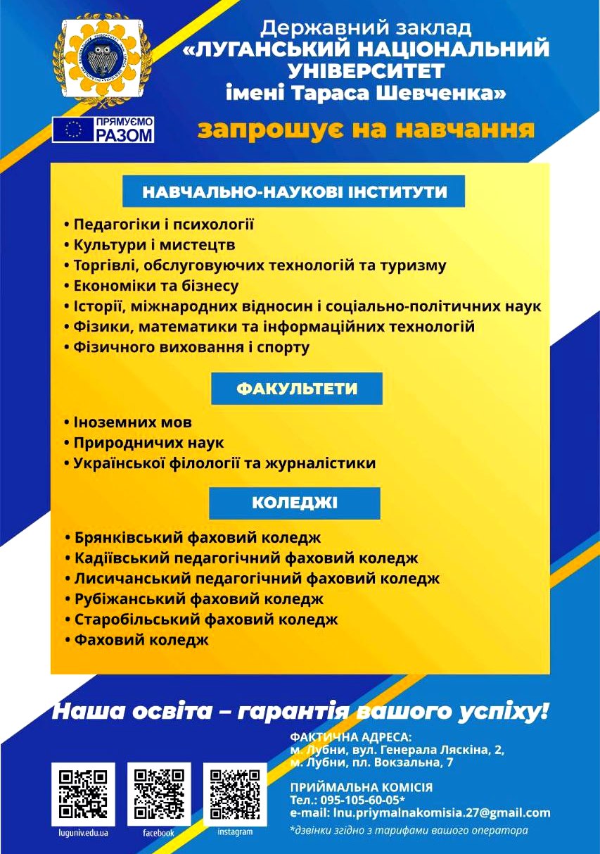 Чекаємо Вас за адресою: м. Лубни, вул. Генерала Ляскіна, 2 (ЗОШ № 10), м. Лубни, пл. Вокзальна, 7, де представники Приймальної комісії Луганського національного університету імені Тараса Шевченка нададуть всебічну допомогу щодо вступу-2023.