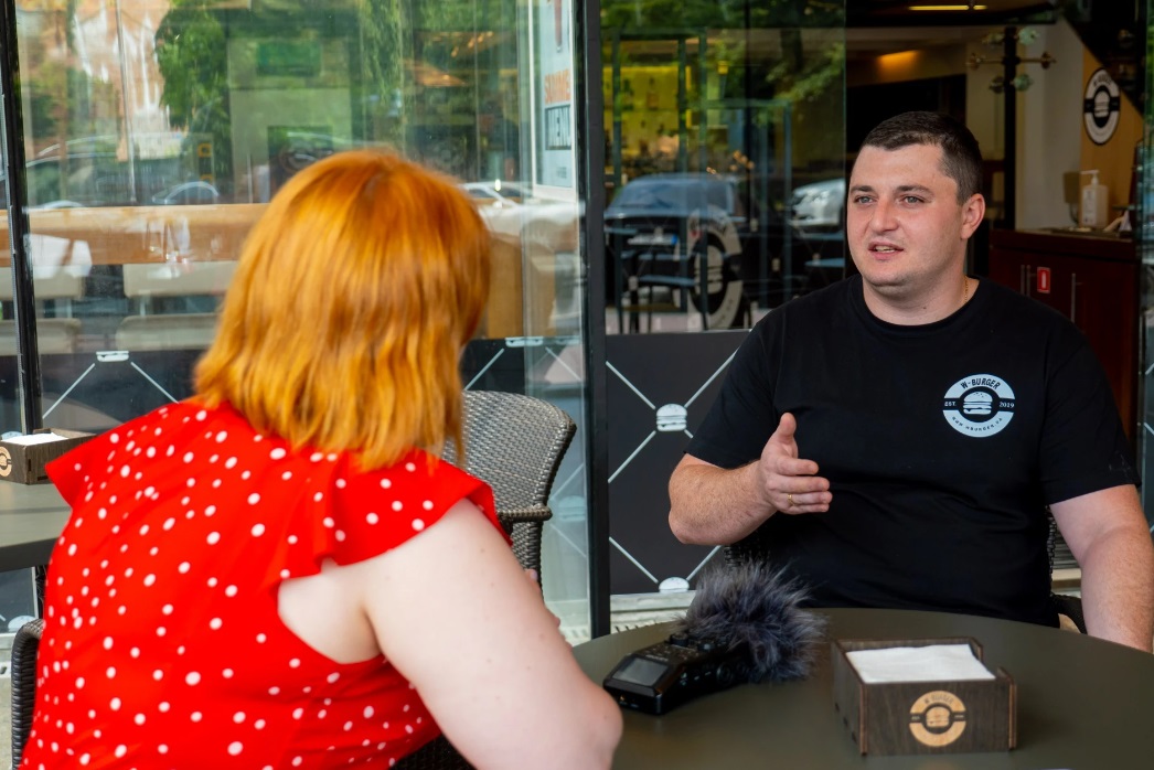 “Логотип у цьому залі — евакуйований зі Слов'янська. А дизайн вигадували всі разом. Тут було багато зроблено: фарбували, ремонтували. Десь близько місяця облаштовували приміщення”, — говорить адміністратор “W-Burger” в Києві Рустам Кондратьєв.