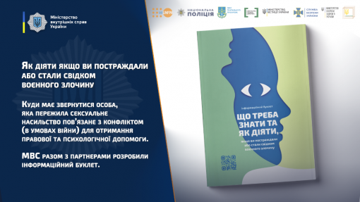 За ініціативи Міністерства внутрішніх справ України при підтримці Фонду ООН у галузі народонаселення (UNFPA), за участі Національної поліції, Служби безпеки України, Офісу генерального прокурора, Міністерства юстиції України та Міністерства охорони здоров’я України, а також Системи безоплатної правової допомоги та Національної соціальної сервісної служби розроблено інформаційний буклет, який розповідає про те, як діяти якщо особа постраждала або стала свідком воєнного злочину.