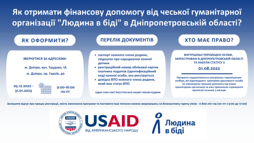 З 15.12.2023 р. до 31.01.2023 р. реалізується програма грошової допомоги для набувших статусу внутрішньо переміщених осіб з 01.08.2022 та проживаючих в Дніпропетровській області. (Увага! У новому році реєстрація розпочнеться з 03.01.2023 року).